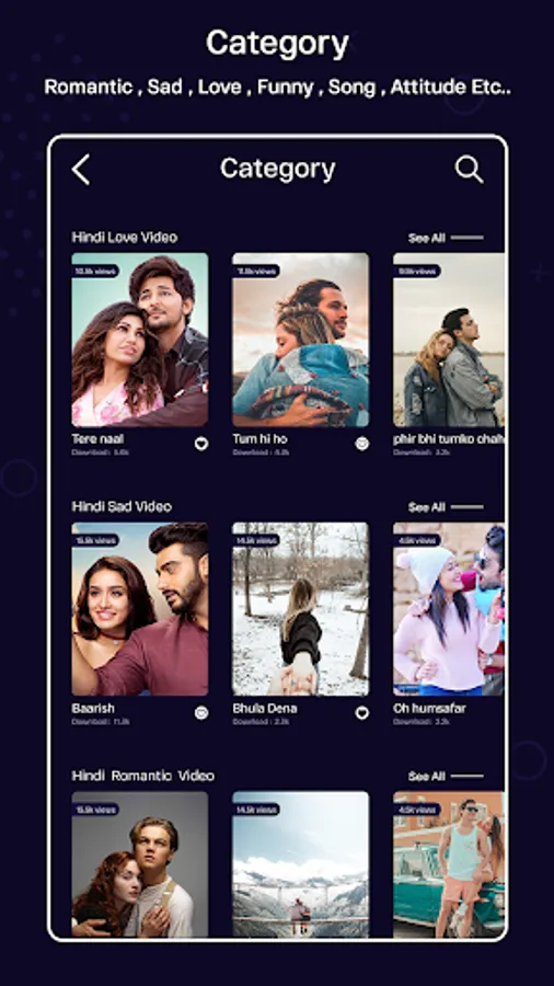 video status for whatsapp app Are Provide By Multiple Category By Love, Sad, Romantic, TikTok, Cute, Friendship, Attitude, Proposal, Breakup Animated, Devotional, Cool, Funny, Festival, Fathers Day, Friendship Day, Navaratri, Independence Day, Diwali, Christmas, Happy New Year, Wedding Video Status.