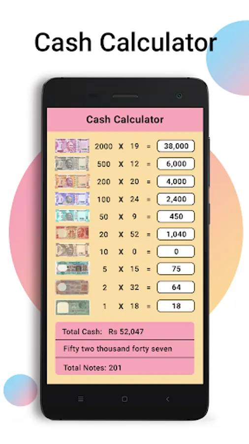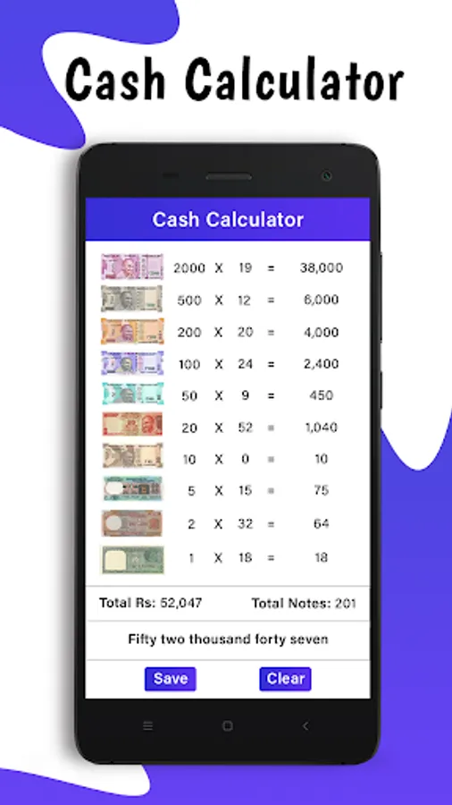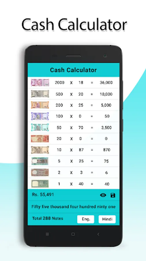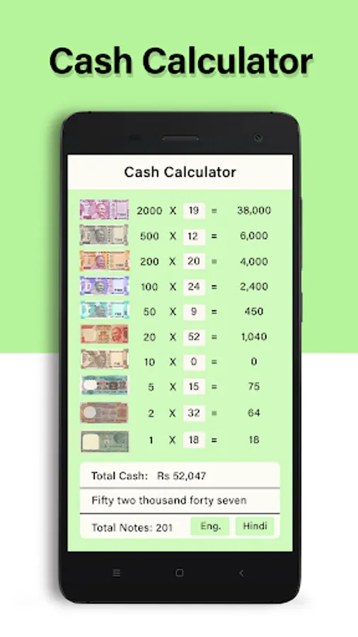 Calculate Cash easily with denomination of Indian Rupee Cash Counter.