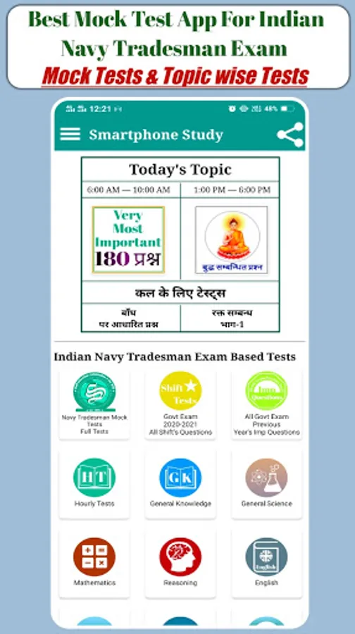 This a Android App for Indian Navy Tradesman Exam 2021. In this app users will get mock tests for Indian Navy Tradesman Exam and it's model papers. Users will able to grade up their preparation for this exam. With this app users can also Grade up their General knowledge and math solving power.