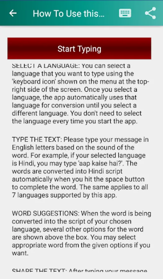 6. Very Easy to use. You don't need to use those complex Indic keyboards anymore. You don't need to be very accurate in the sound too. The app is intuitive enough to understand what you are typing and converts accordingly. The app shows some suggested words also as you are typing your words. You can choose from them too.