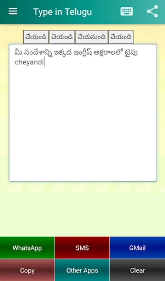 2. Words will be converted automatically when you hit the space button after typing the word. The conversion happens based on the 'sound' of the word you type in English. You don't need to learn how to type complex combinations of native language letters. Just type the sound in English and your word will be converted automatically. For example, if your selected language is Hindi, you can type 'namaste' and it will be converted into Hindi script as 'नमस्ते'. Like wise if you select Telugu, it will be converted as 'నమస్తే'.