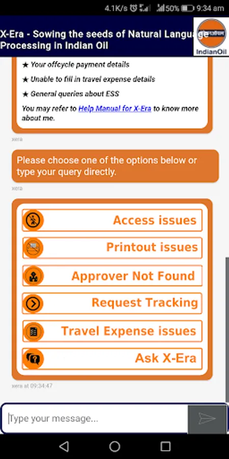 XERA is the ESS Robot Assistant for IOCL employees, a seed sown in the wake of Artificial Intelligence which answers queries related to ESS services.