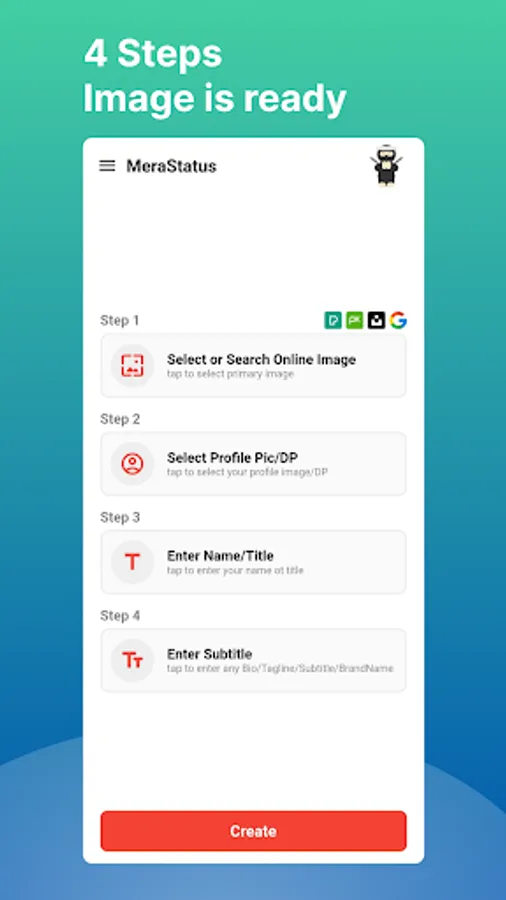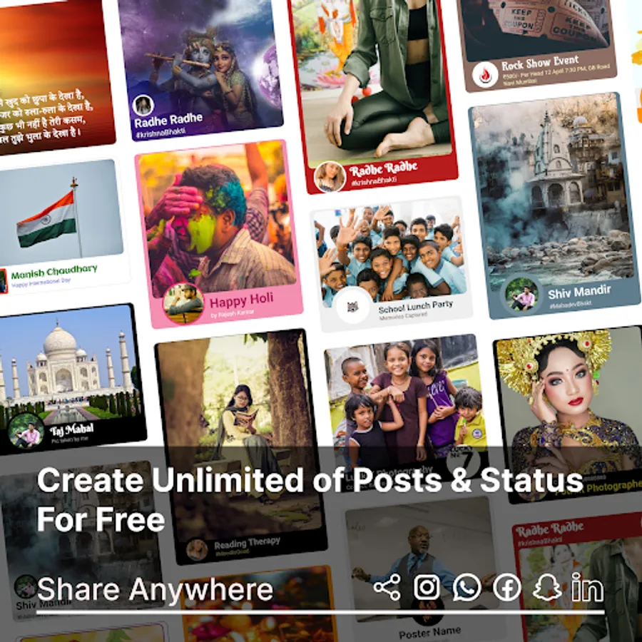 A simple app with 4 steps to create any social media post, poster for any event, or wish any by making Birthday poster, Holdi poster, Guru Purnima poster, Nag Panchami poster, Ranga Panchami poster, Janmashtami poster, Hartalika Teej poster, Ganesh Chaturthi poster, Anant Chaturdashi poster, Gandhi Jayanti poster, Karwa Chauth poster, Chhath Puja poster, Navratri poster, Ram navami poster, Dussehra poster, Diwali poster, Raksha Bandhan poster, Republic day poster, Independence day poster, Teacher's Day poster, Christmas poster BJP poster, Congress poster, any political party poster or any other poster.