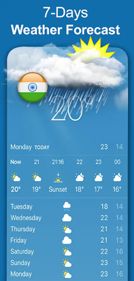 India Weather live app is made for anyone who need to check daily weather. With our India Weather app, you can stay up to date about weather of your locality. With India Weather radar you can choose your city and then check its weather forecast of up to 14 days. Stay alert about coming weather with our India Weather App.