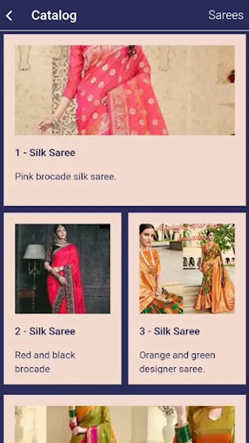 All types of silk Sarees like Paithanis, Kanjiwarams, Wedding ones and Designer Sarees of our own creation and All the best catalogues of the season.