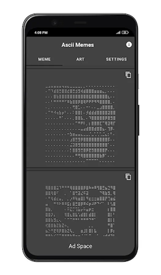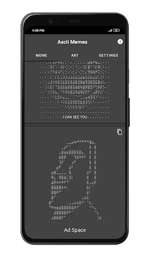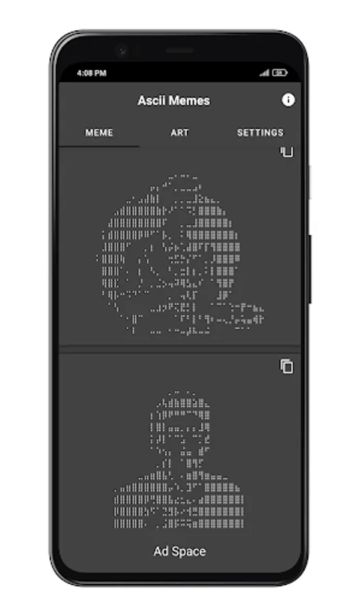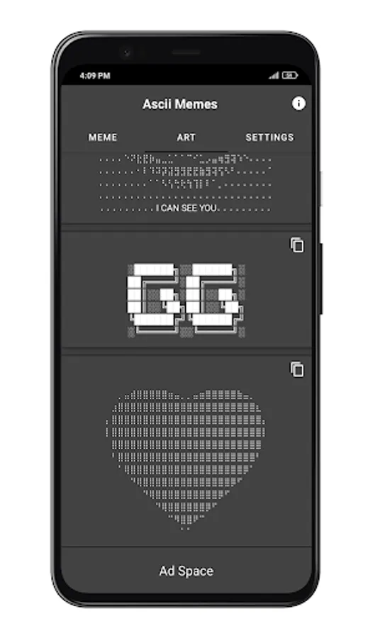 Discover and effortlessly share trending ASCII/Text memes with our app! With just a simple copy and paste, you can unlock a world of creative expression through Text Art. Express your humor, emotions, and thoughts with the power of ASCII art/memes and join the exciting ASCII Art/Meme revolution. Our app offers a diverse collection of popular ASCII memes, including iconic ones like Rick Roll, Moai/Sigma, Among Us & Troll Face. Whether you're chatting with friends, posting on social media, or creating captivating content, these ASCII art/memes will add a touch of fun and uniqueness to your messages. Elevate your communication with the magic of ASCII and embrace the Text Art/Meme phenomenon today!