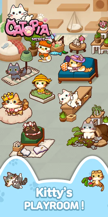 Catopia is a game where you can merge cute kitties together, decorate them with accessories, feed them and show off by participating in cat contests.