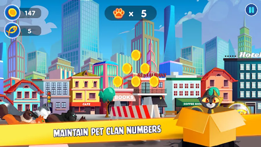 Pet Invasion: Street Rescue is all about Pets! Control your pet (mainly cat) to run around the cities in an invasion to collect all fellow stray pet. Topple over all bin & can to free our same kind, and don't forget to avoid the annoying human vehicle on the run!