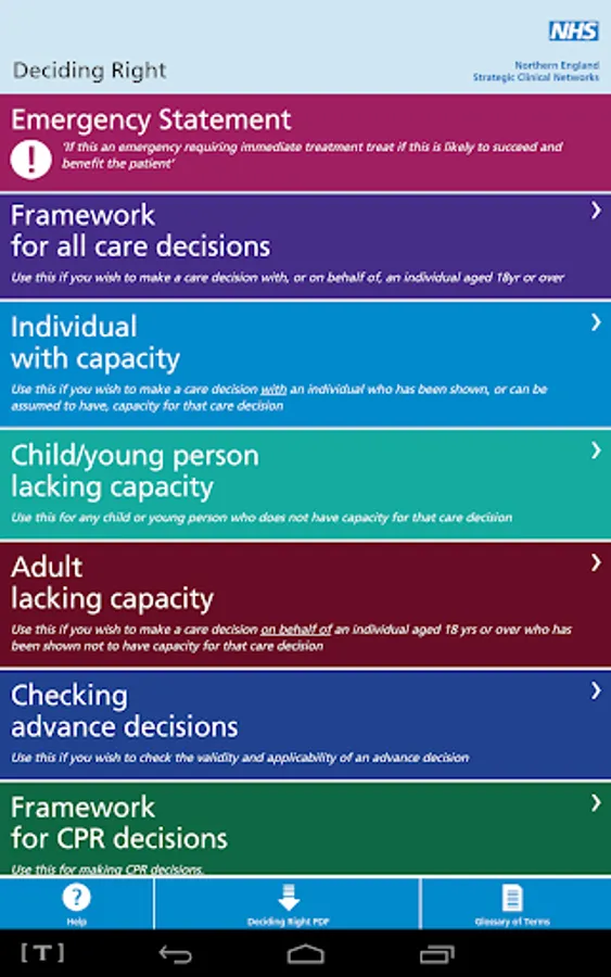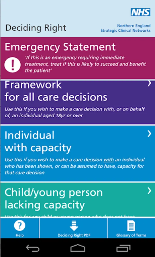 This app supports shared decision making that is compliant with the Mental Capacity Act (MCA) and national guidance on CPR decisions and advance care planning. The app includes access to the Deciding Right toolkit which supports shared decision making and advance care planning conversations (www.nescn.nhs.uk).