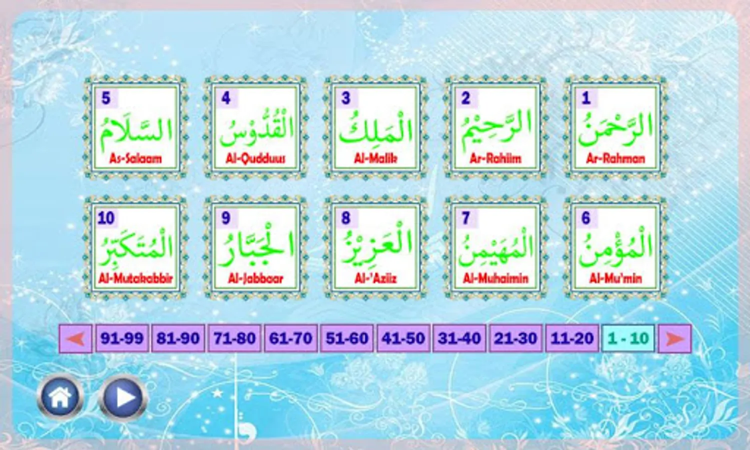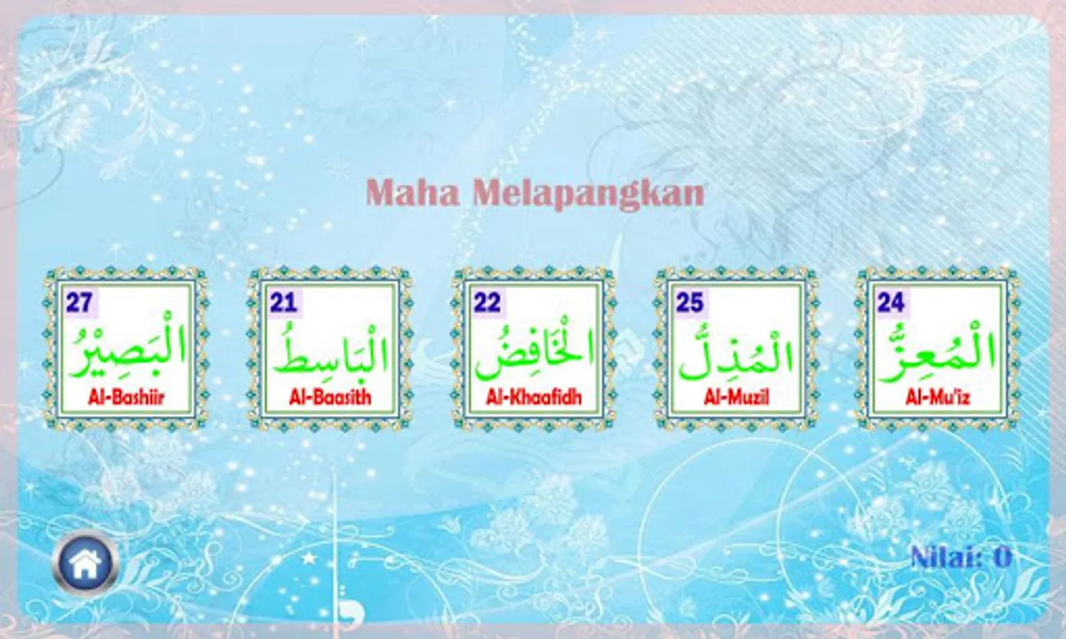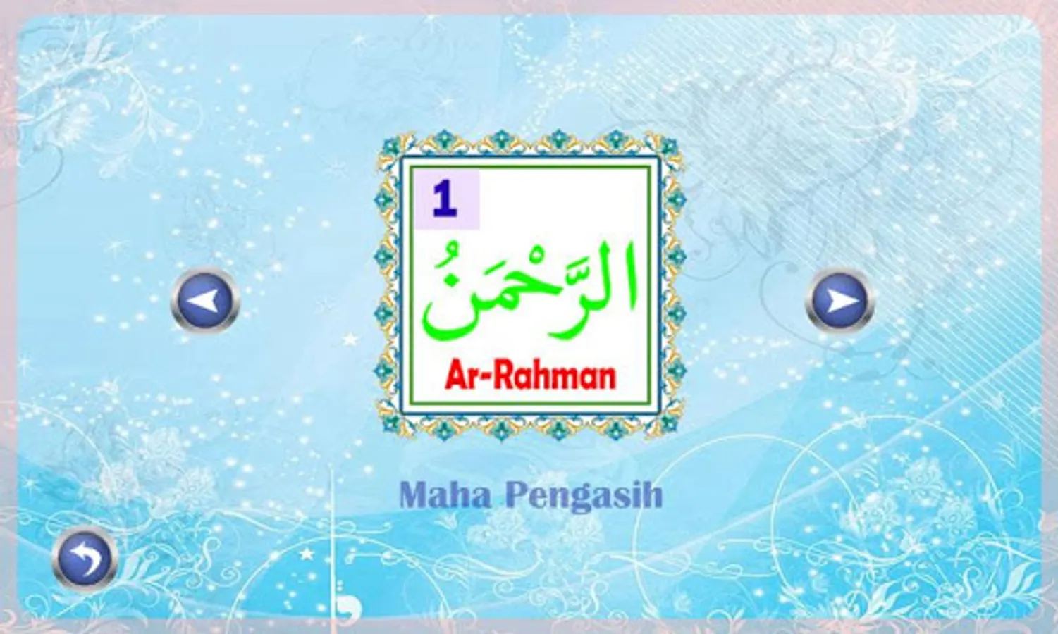 The Asmaul Husna Learning Application teaches about the 99 Names of Allah interactively accompanied by their pronunciation. The purpose of this application is to make it easier for us to memorize the 99 Names of Allah in a practical way so that we can practice them in everyday life.