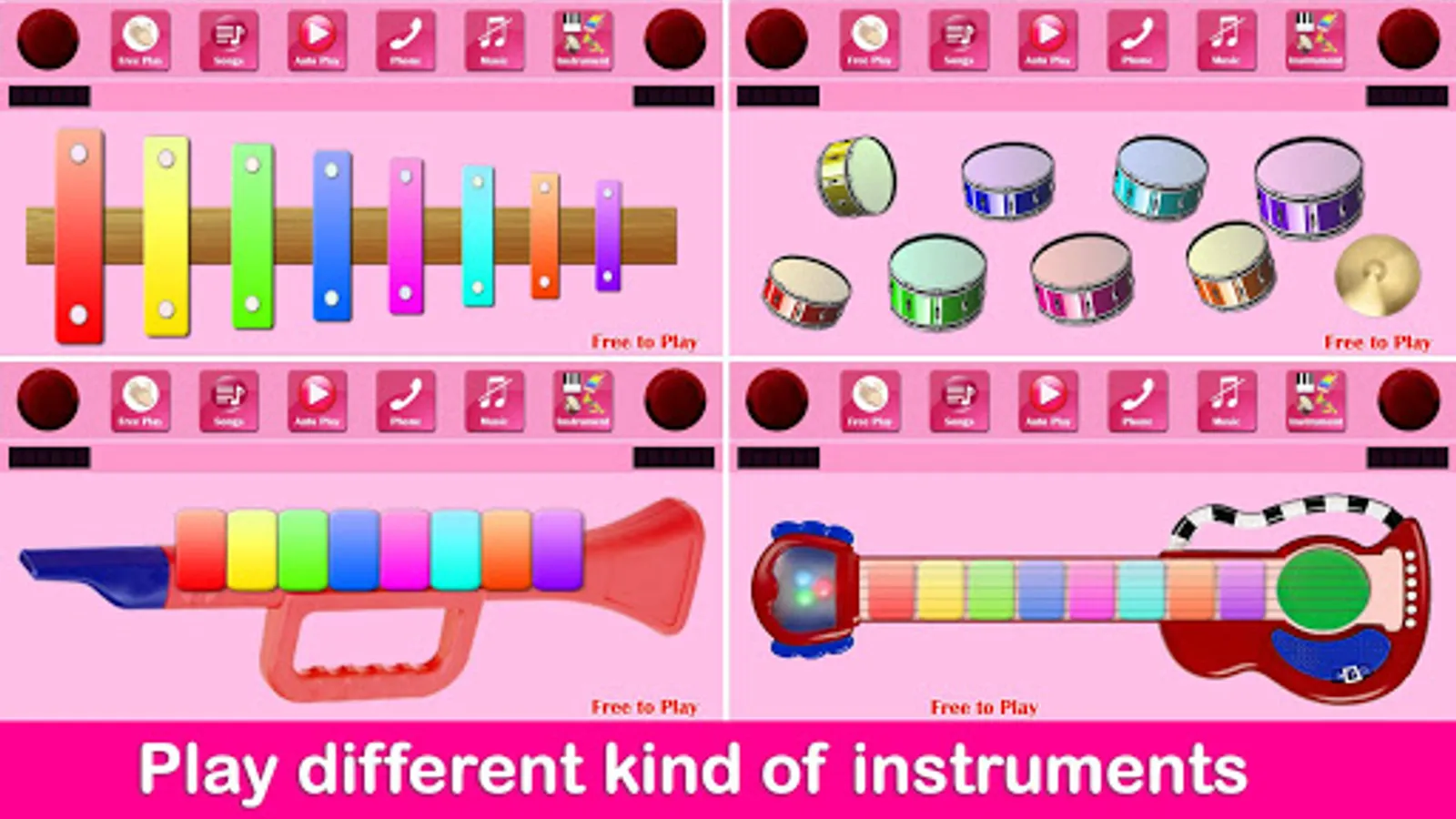 The pink theme of the Kids Piano music and songs for children and girls. Your daughter will love this app because Kids Pink Piano is designed for a girl. This game has 5 music instruments (piano, xylophone, drum, trumpet, and guitar).