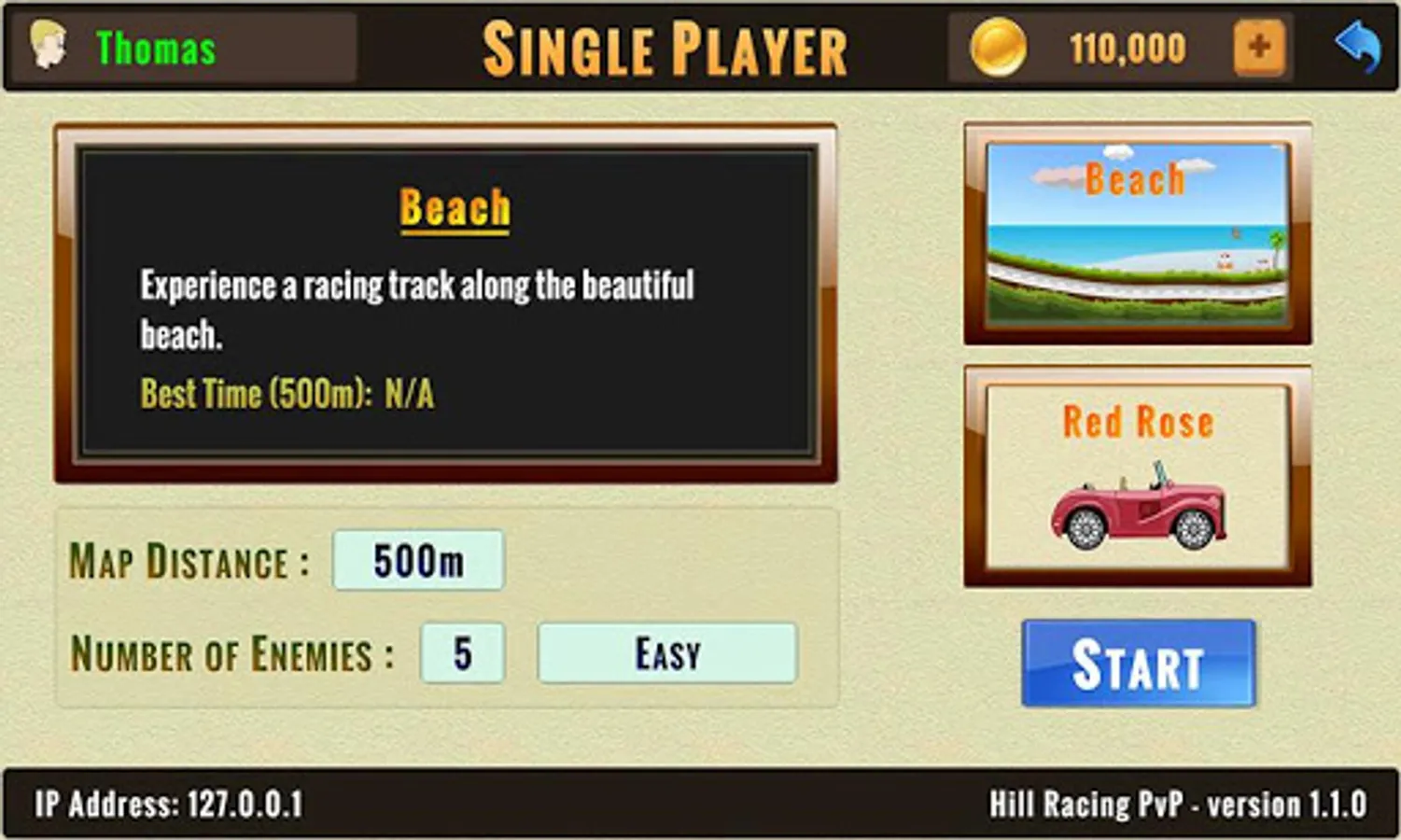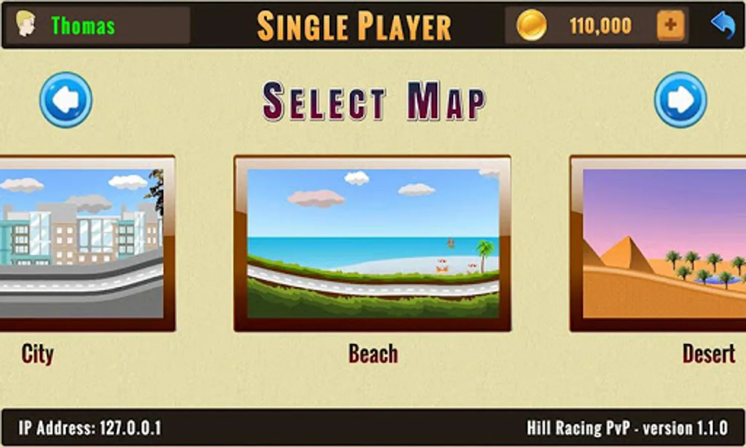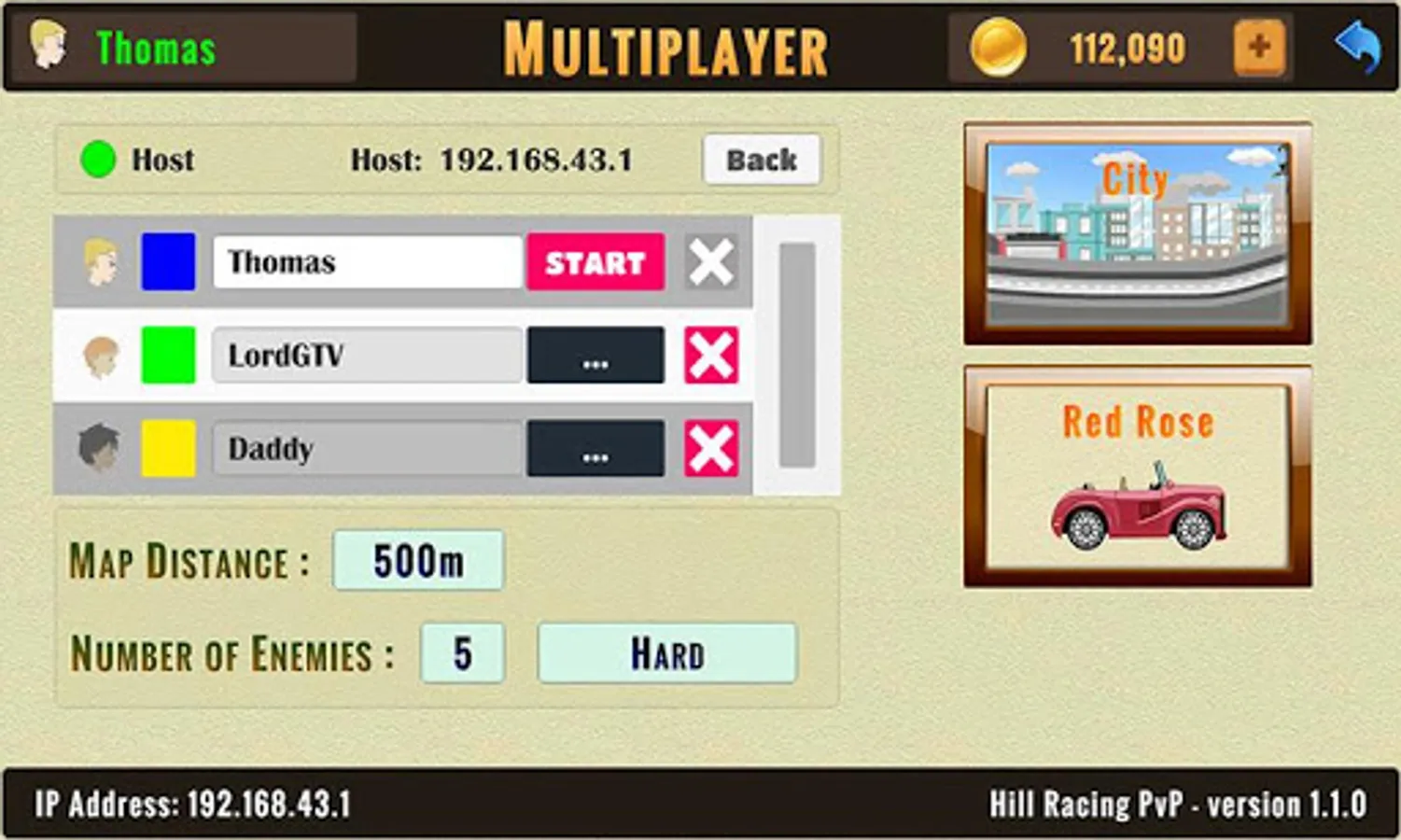 Hill Racing PvP enables you to play against family and friends over local area network (LAN). You should connect to the same Wi-Fi hotspot and use same version of this application for a multiplayer game. You can type the host IP address or search host to join a multiplayer game.