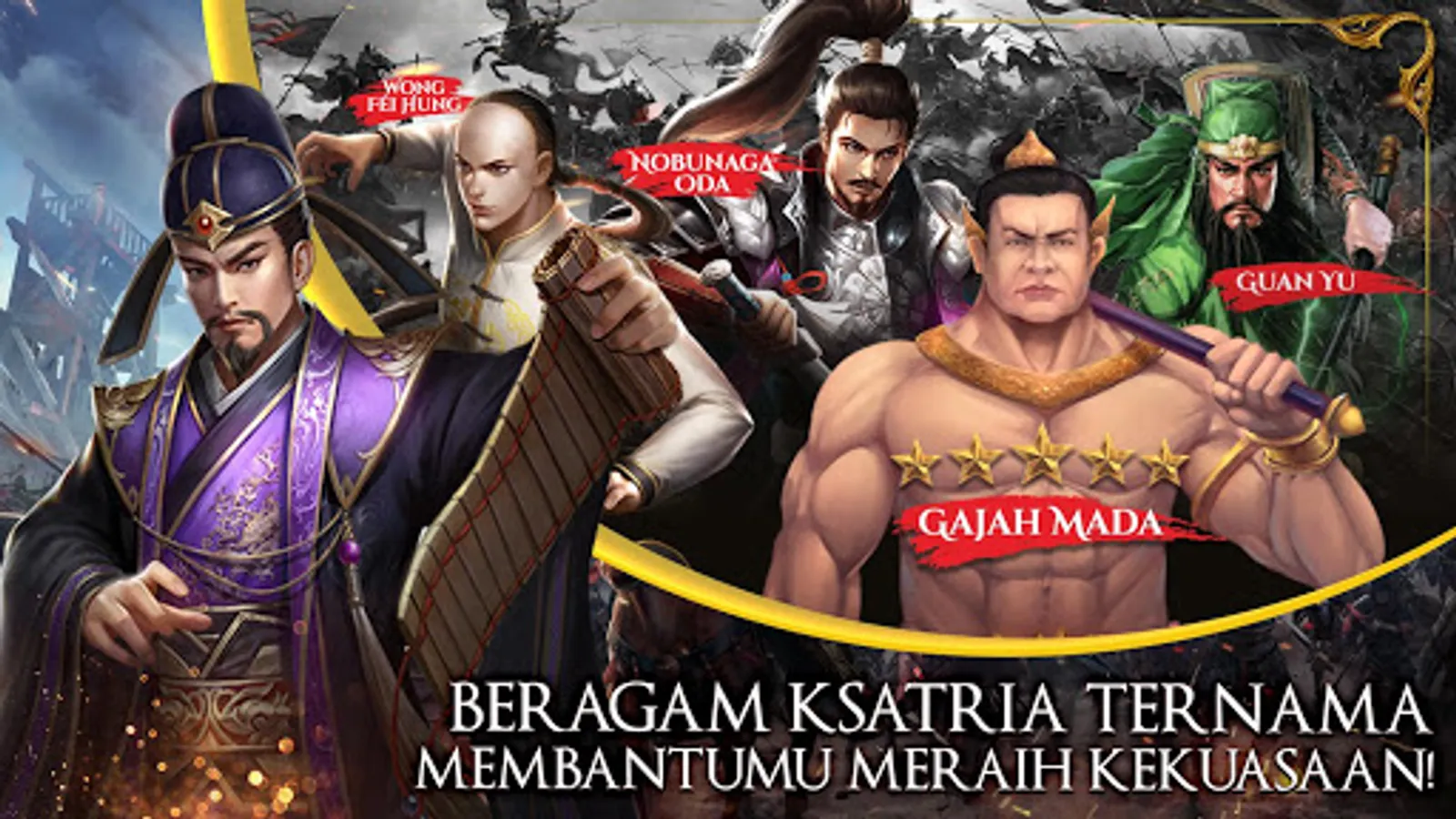 War generals from all over the country, China, Japan and the archipelago gathered to unite forces to help the Chosen Emperor against the Rebellion and restore the country's glory, Recruit Cao Cao, Lu Bu, Guan Yu, Zhao Yun from 3 Kingdoms or Nobunaga Oda the Samurai Knight and even the Archipelago Knight Gatot Kaca and Gajah Mada are ready to help!