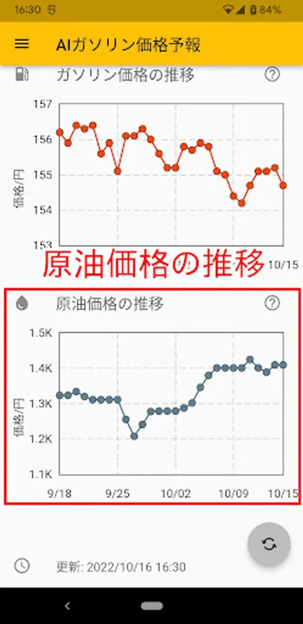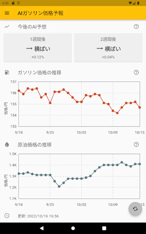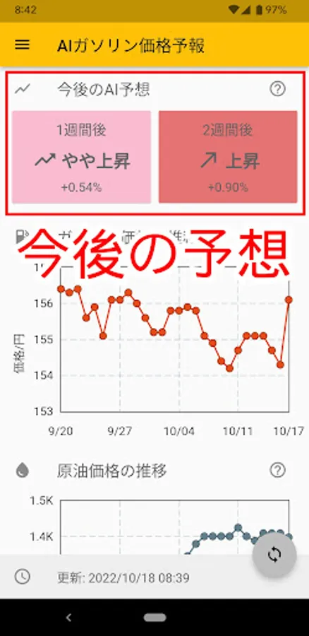 When you start the app, the gasoline price trend for the next 1-2 weeks is displayed in 5 stages: "rising", "slightly rising", "flat", "slightly falling", and "falling", and the expected rate of change is also displayed in %. display.