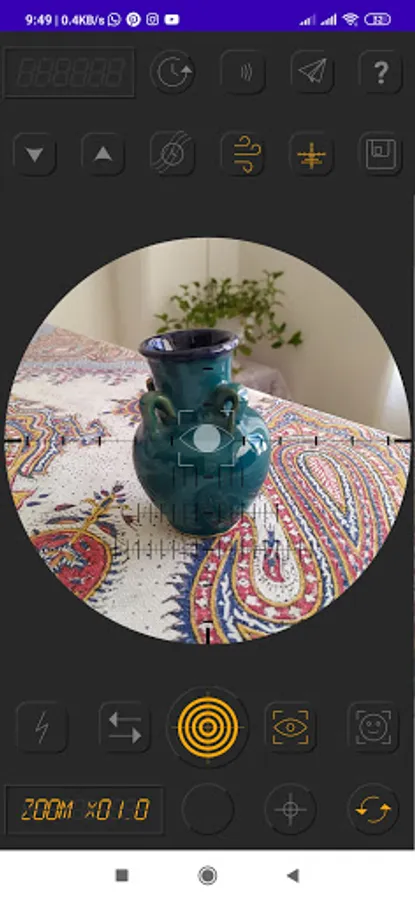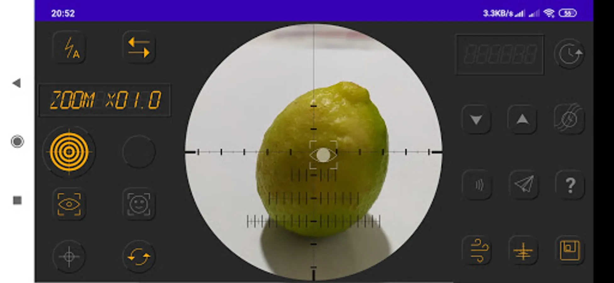 SniperScope is a simple funny photography app . It lets you simulate capturing a photo through a sniper scope preview and save two photos on your device external storage , one with overlay and another is the original image without overlay . The overlay is like what you can see through a sniper scope , contains mil-dots , wind indicator and even a laser pointer mark . It also contains some other photography facilities like face detection and auto focus and auto flash depending on your device camera supports them . Once photo captured, the app lets you share it to other applications if Send button is turned on . The app contains a simple help for each button that appears beside it like a hint guide line if "?" button is on and you tap on each button at the same time . If "?" button is off , each buttons functions as desired for it.