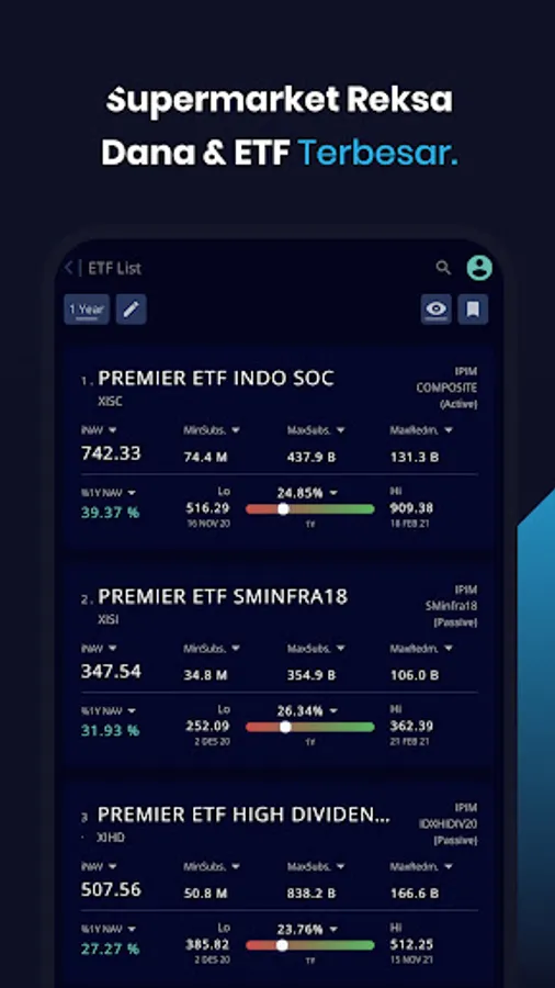 IPOTFund is here, the biggest mutual fund & ETF supermarket in Indonesia. You can choose hundreds of mutual fund & ETF products from dozens of investment managers that are available with just one application and one account. IPOTFund has been registered with the OJK since 2014 and is part of PT Indo Premier Sekuritas which has been registered since 2002. Enjoy advantages and conveniences with just one finger, one application, and one account.