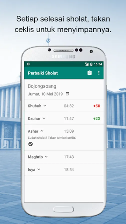 In this application you can see prayer schedules in your area. If the prayer time has arrived and you have finished doing the prayer, press the check button to save it. If you pray at the beginning of time, the application will give a green color. If the prayer is mid-time, the color is yellow and if you pray at the end of time, the color will turn red.