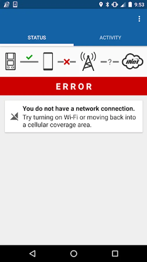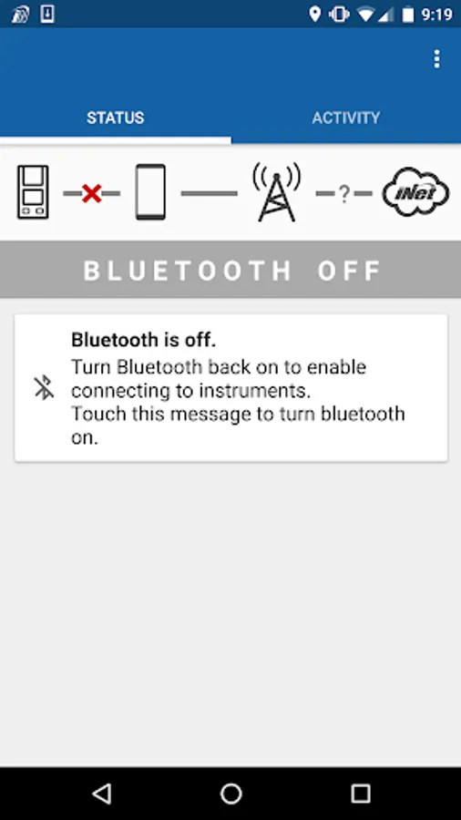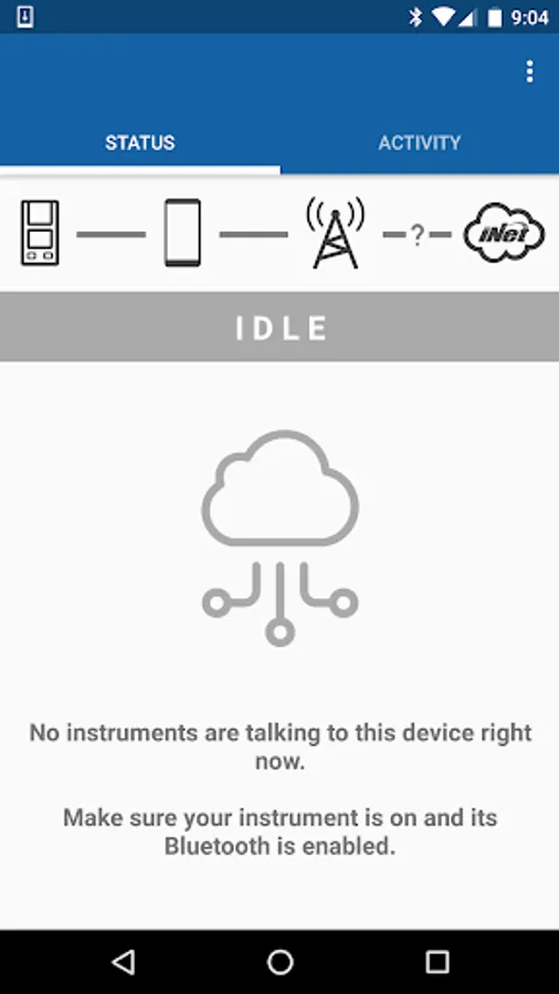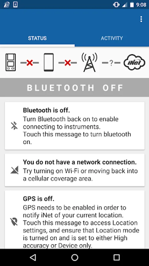 • Status tab - Presents connection status so workers know communication across gas detectors, the smart device, and the iNet® Cloud is fully functional.