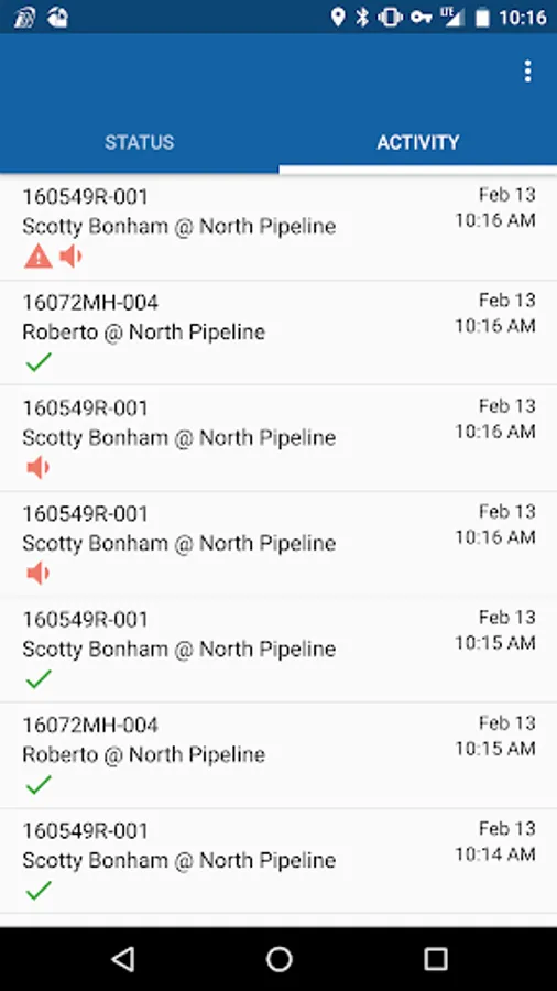 • Activity tab - Presents a list of the alerts that have been generated from gas detectors. The alerts span panic, man down, and gas alarms. All alert conditions can be configured by the supervisor.