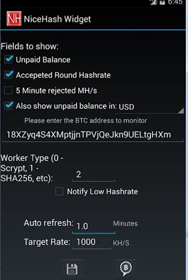You can see your current hashrate, reject rate, unpaid balance and even automatically convert the balance to one of the supported currencies. Just type in your BTC address, choose the currency, refresh interval, whether you would like to receive notification for low hashrate and you're ready to go.