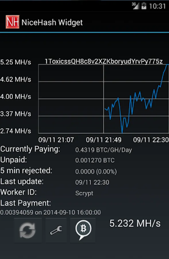 You can also view the hashrate graph by simply tapping on the widget. This widget supports multiple workers (Scrypt, SHA256, X11, etc) on the same BTC address.