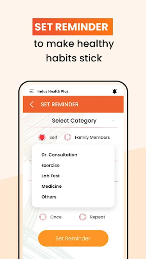 - Set reminder – Set reminder for Self & Family Members for Medication, Dr Consultation, Exercise, Others etc.