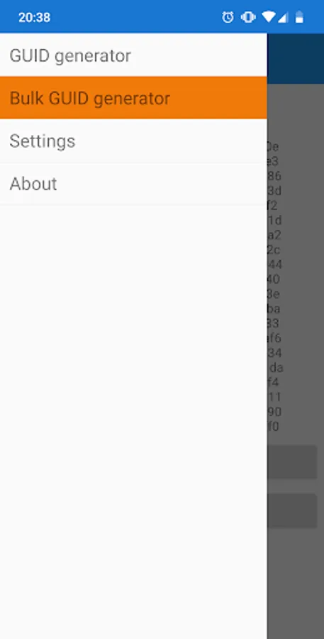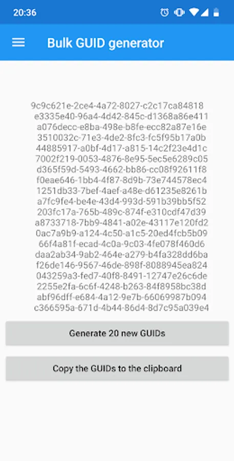 With this application you can generate new GUID (also known as UUID). You can generate them one at a time, or many GUIDs in bulk (up to 10000) at a time. Then you can copy them to the clipboard.