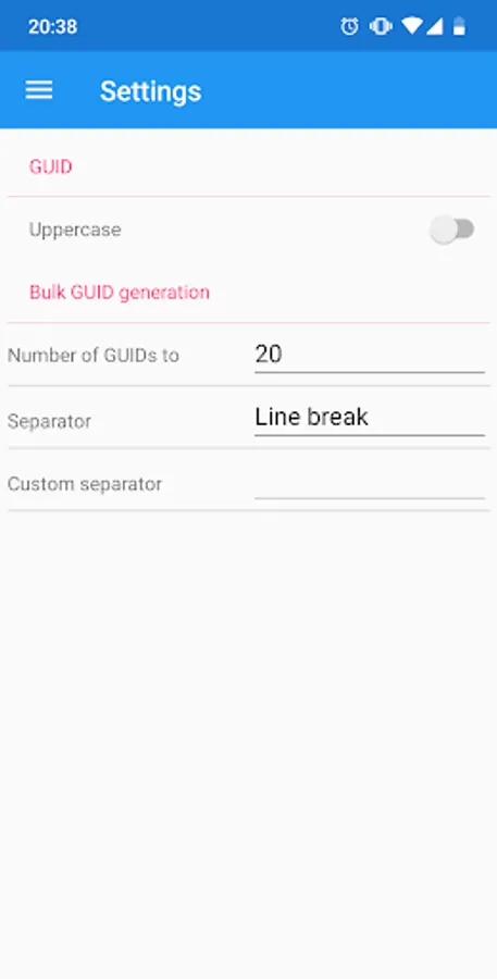 In the settings you can configure various parameters such as for the GUIDs to be uppercase or lowercase, the batch size (the number of GUIDs to generate at a time), the separator string to use between the GUIDs.