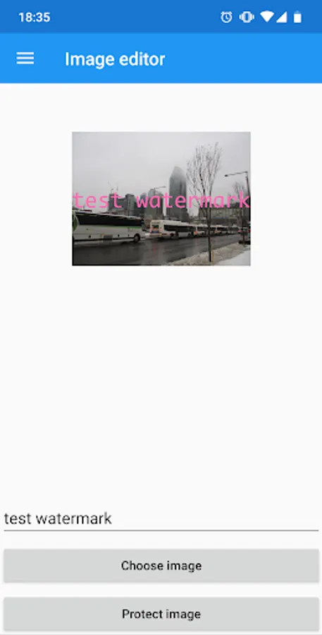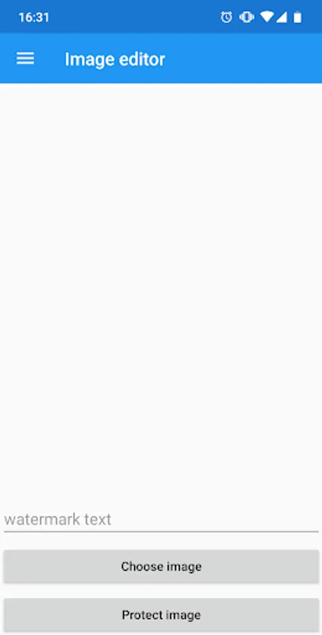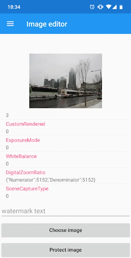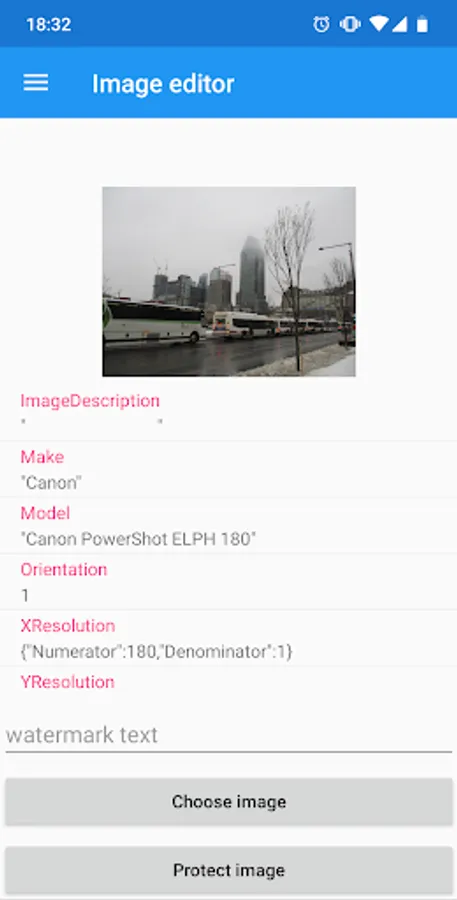 It works like this: you select an image from the device storage, the image is displayed in the application along with its EXIF metadata, then you enter a watermark text (or you can leave it empty for no watermark), click a button to protect the image, and the modified image is saved to the device storage as a new file to the same folder as the original image file (the original image file is not modified and not deleted from storage).