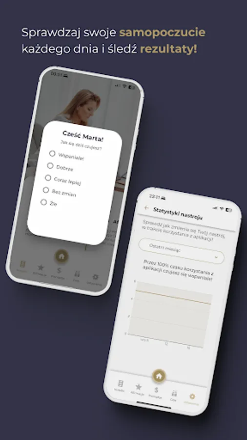 Every day you are asked about your well-being to track your progress and check how your mood changes while using the application over a selected time period.