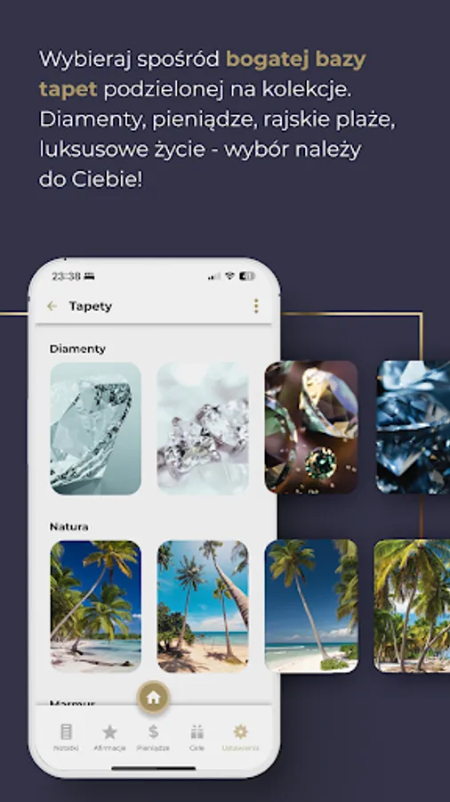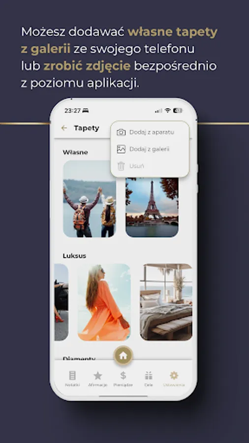 In the settings you can change the wallpaper. Choose from a rich database divided into collections, which is constantly expanded with new ones. Diamonds, money, paradise beaches, luxurious life - the choice is yours! Now you can also add your own wallpaper! Select a graphic from your phone's gallery or take a photo directly from the application. With this feature you can add a photo of the specific goal you want to manifest! If over time you decide that you no longer need any of the wallpapers you have uploaded, you can delete them. Just hold the selected graphic with your finger and add it to the basket.