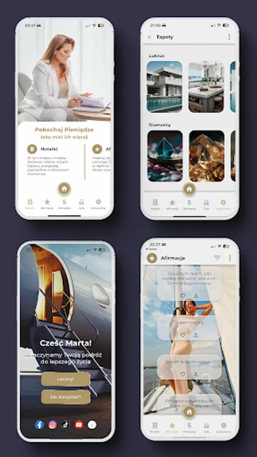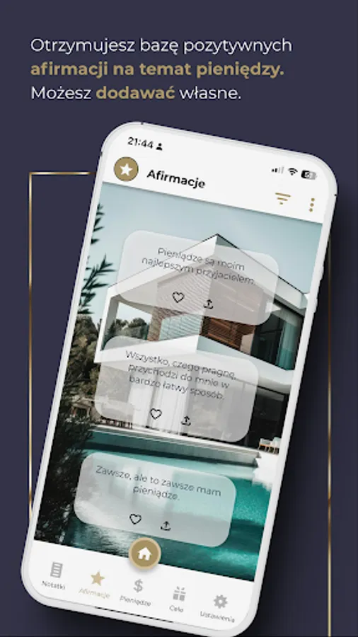 You will find a lot of positive affirmations about money here. You can also add your own, mark them as favorites and share them with your friends. You receive daily notifications with affirmations for the day. You can select up to 10 notifications per day! You decide on their frequency and set the time yourself. Choose whether you want to receive affirmations for women, men, or all.