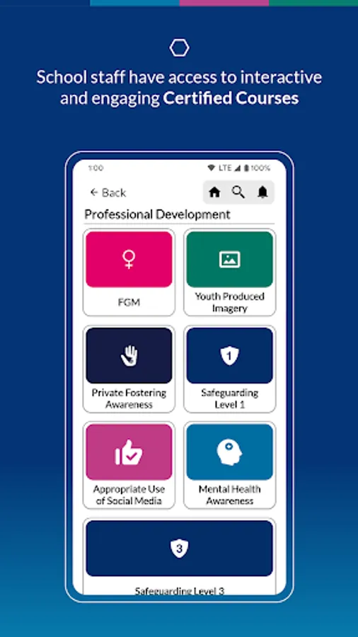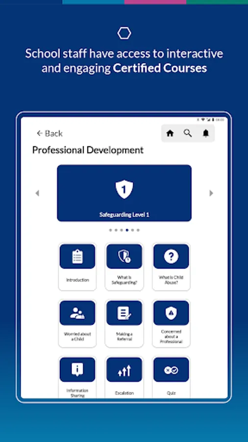 For school staff, CPD certified training courses are available to take directly within the App. Topics include Safeguarding Level 1, Mental Health Awareness, and Appropriate Use of Social Media.