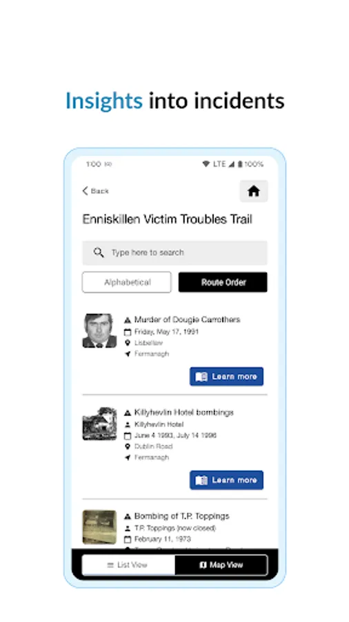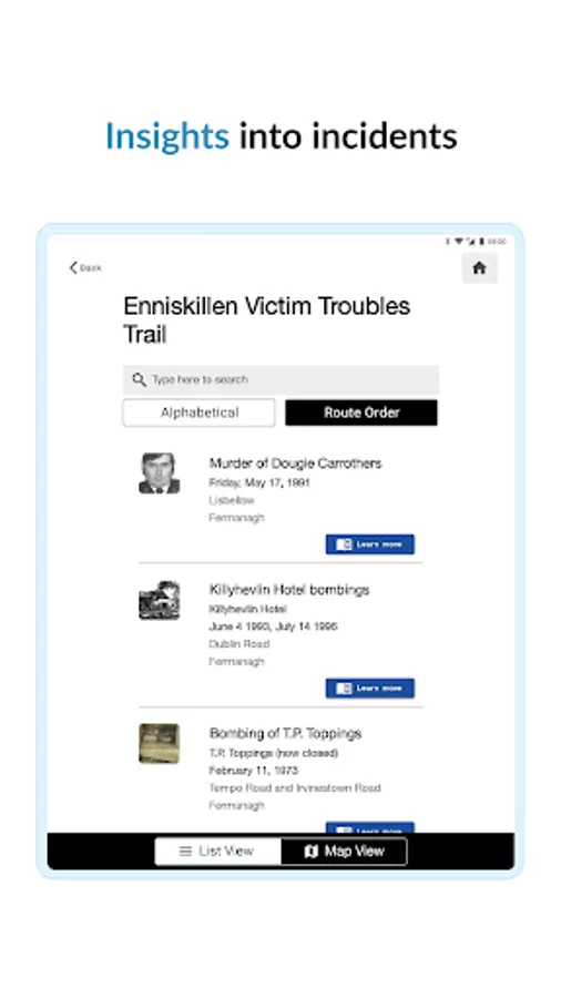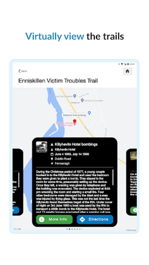 The first trail that has been contained within the App is the Enniskillen and District trail, which highlights the impact those difficult times had on the town and the surrounding district over a 30 plus year period; including one of the most horrific atrocities of ‘The Troubles’ - The ‘Poppy Day’ bomb which resulted in the murder of 12 innocent people. Over the next 12 months we will be adding additional trails to this App.