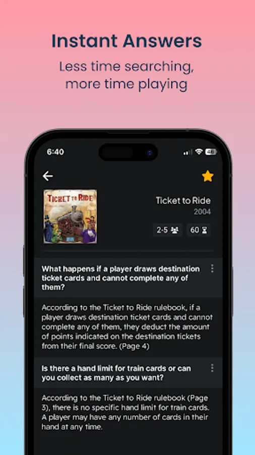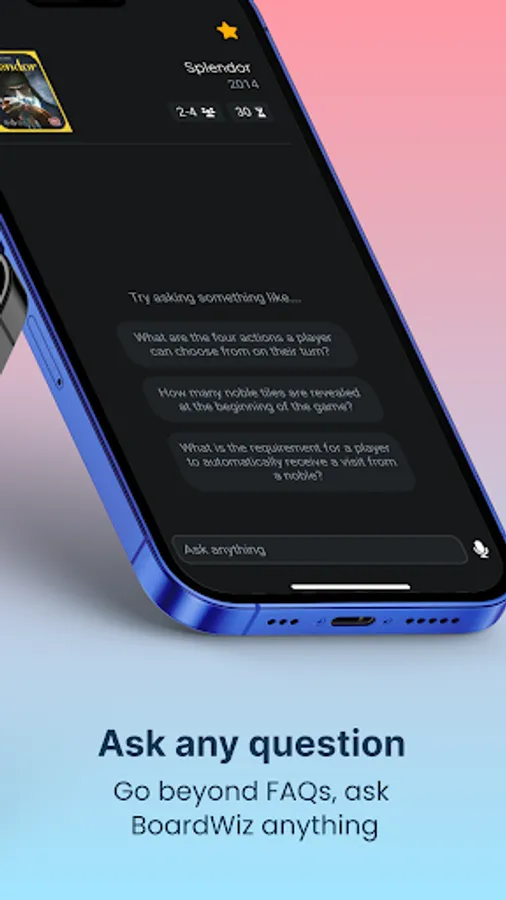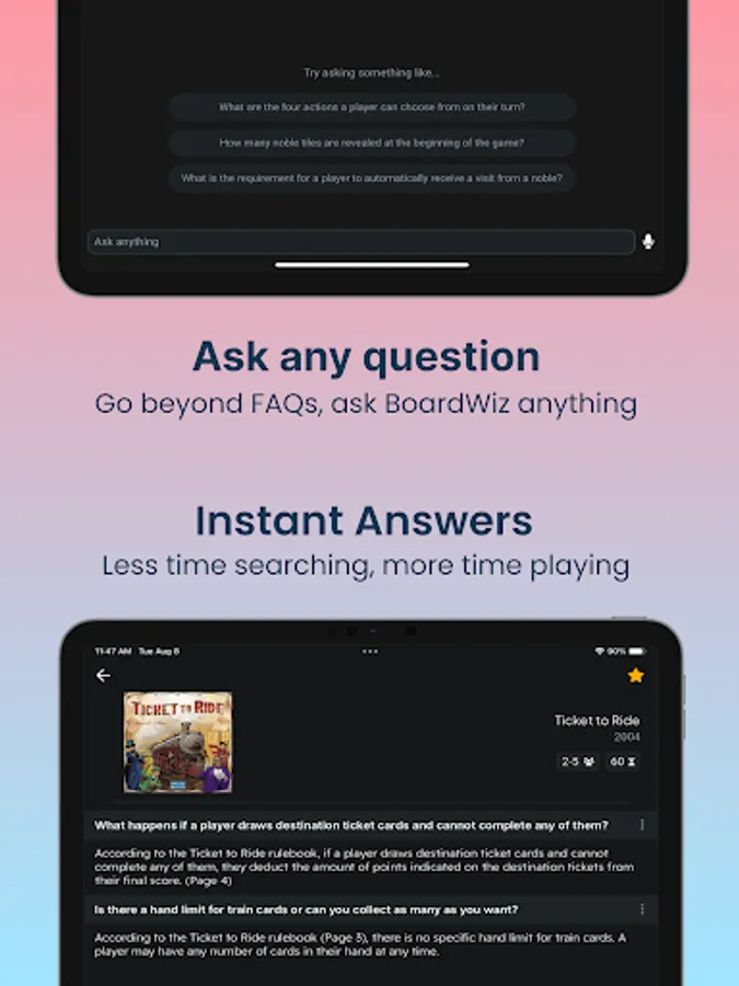 Select from an ever-growing collection of board games and get answers to your questions instantly. BoardWiz provides you with exact page references for each answer, making it a breeze to validate any rule. Whether you're navigating the intricacies of a strategy game, or just need a refresher for a classic family game, BoardWiz is your on-hand expert. Try it free and experience the magic for yourself!