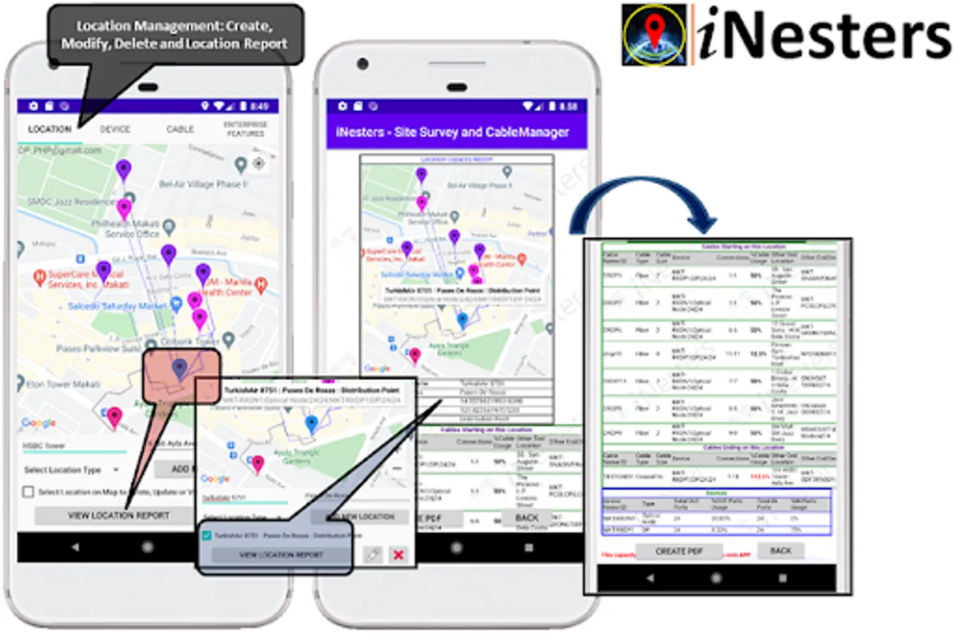 4. Location Capacity Reporting – user can generate a PDF report on a Location that will provide information on all Devices and Cables connected to the Location and report on the available Capacity, user also can save the PDF report on the device which can be used later or send it by email