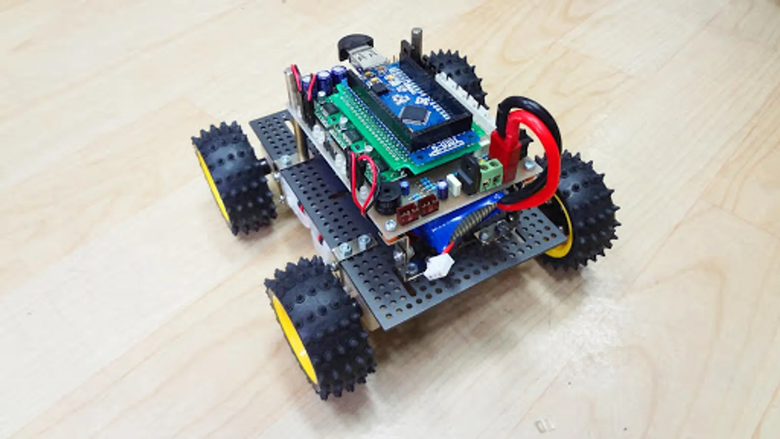Time to change IOIO and IOIO-Q board to Robot car by IOIO Robotic Activity board (IOIO-RAB) which 6 built-in DC motor driver, 1 Piezo speaker, 4 Servo connectors,and Battery pack connector.