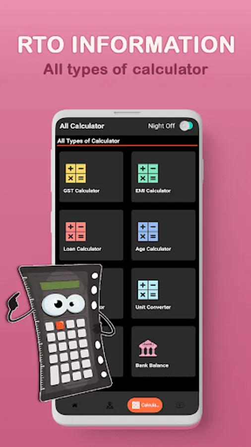 All Types of Calculator are included in the "RTO Vehicle Information, Exam" application this all calculator users full in over daily life Such as: