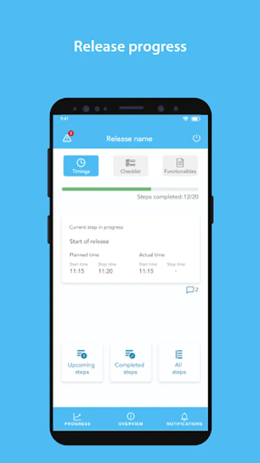 You can view or track your ongoing and upcoming project releases. You are notified each time a step of your release process has started or completed. And validation of release process steps or complete releases has never been so easy.