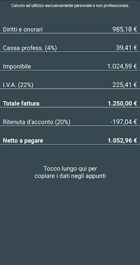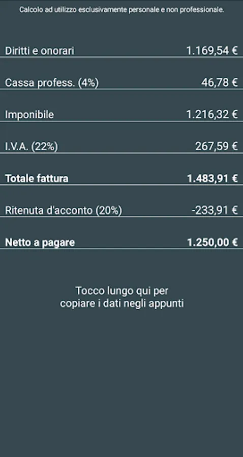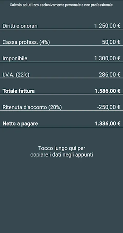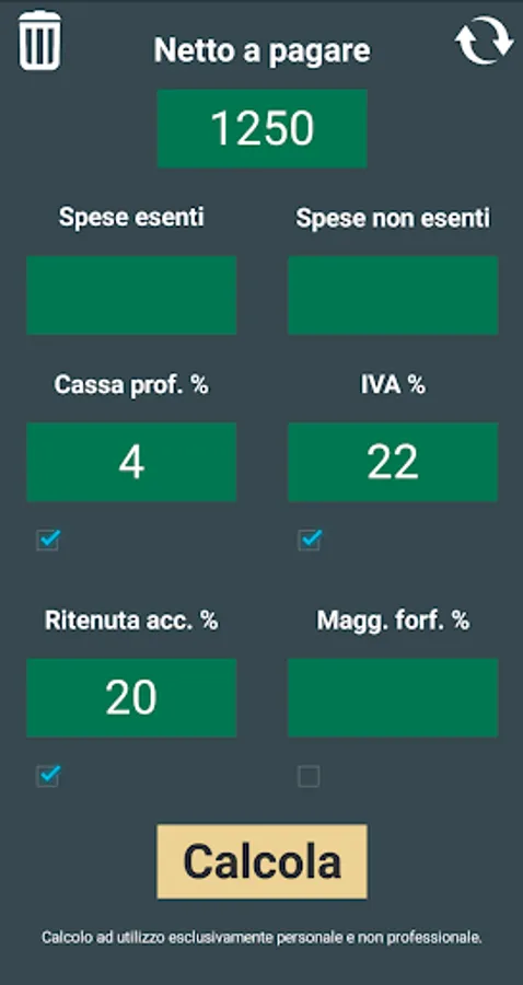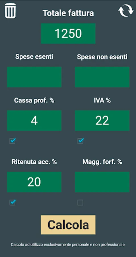 InFattura allows you to diversify the calculation considering three types of use: Rights and fees, Total invoice and Net to pay. To be able to change the type of calculation single touch the icon at the top right; to reset the data, long touch the icon at the top left.
