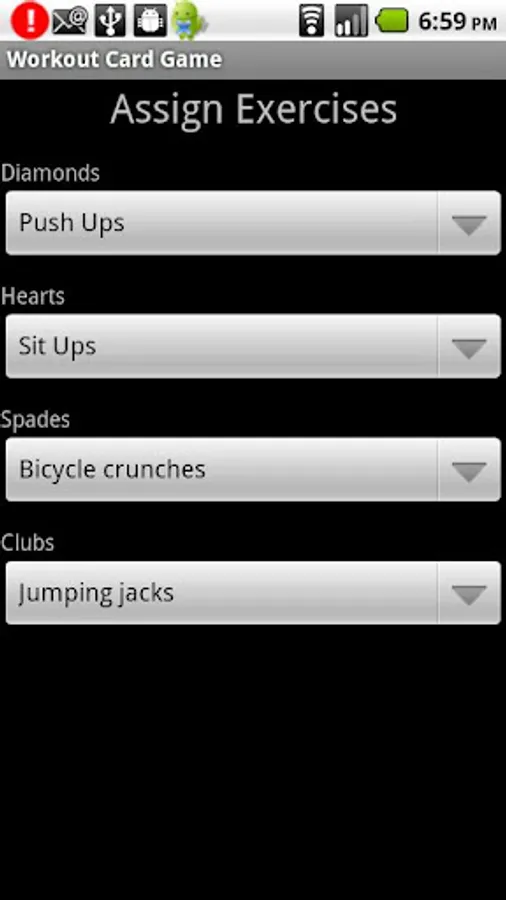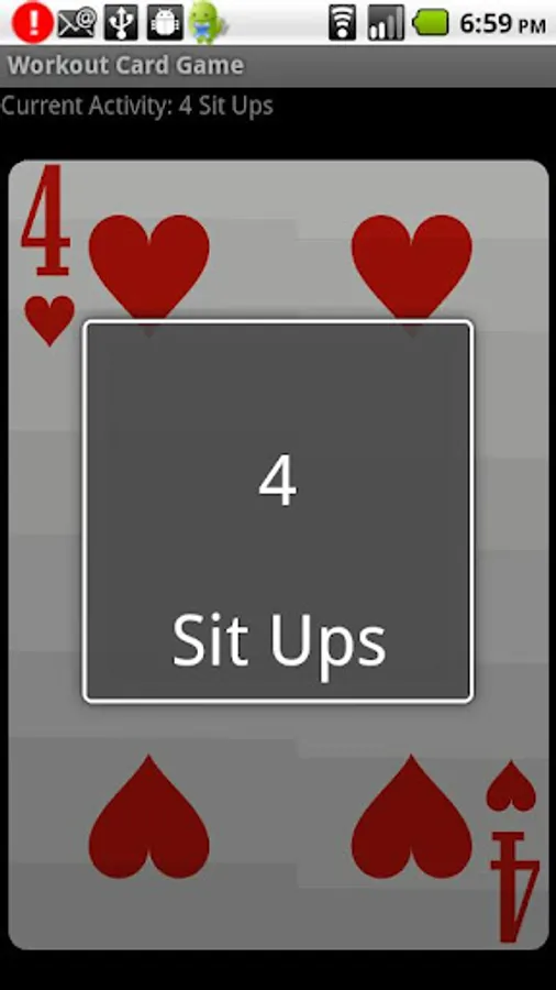 This is an easy to use, customizable card game based workout; set up a full body workout, or focus on abs, arms, legs, or cardio. You can choose which exercise goes with which suit. Aces = 1 min breaks. One full game = 90 reps of each!