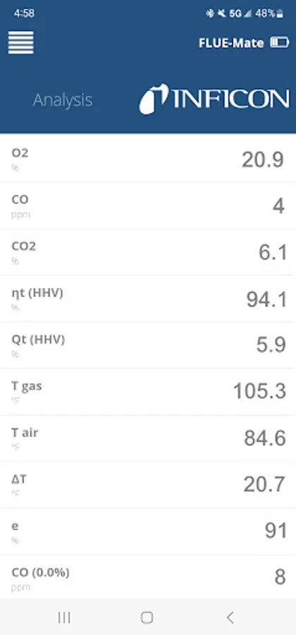 The FLUE-Mate app expands the capabilities of you INFICON FLUE-Mate Combustion Analyzer. The FLUE-Mate app allows you to easily save and share analysis reports using the QR code scan function. This allows you to quickly transfer your analysis to your device without the need for a Bluetooth connection. Additionally, connect your INFICON FLUE-Mate with Bluetooth to see live measurements, so you can keep an eye on your analysis if you step away.