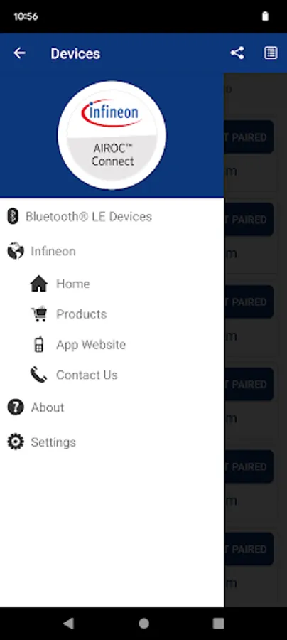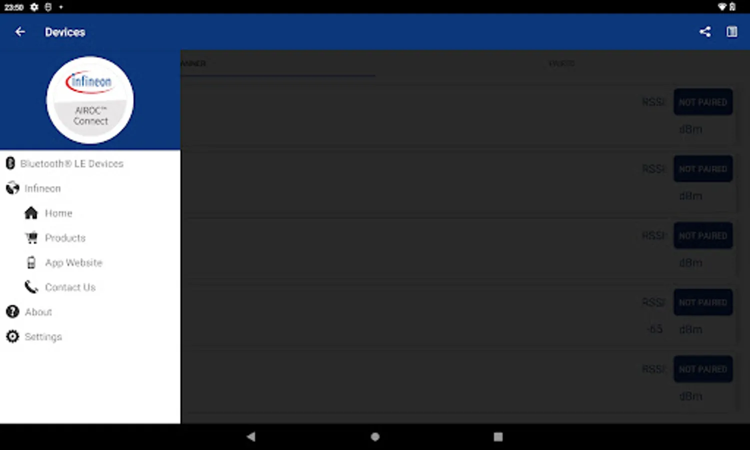 The AIROC™ Bluetooth® Connect App mobile application has been developed for Android and iOS mobile phones and tablets by Infineon Technologies as a companion for the AIROC™ Bluetooth® SoCs, PSoC™ 4-BLE, PSoC™ 63-BLE, and their respective eval kits.
