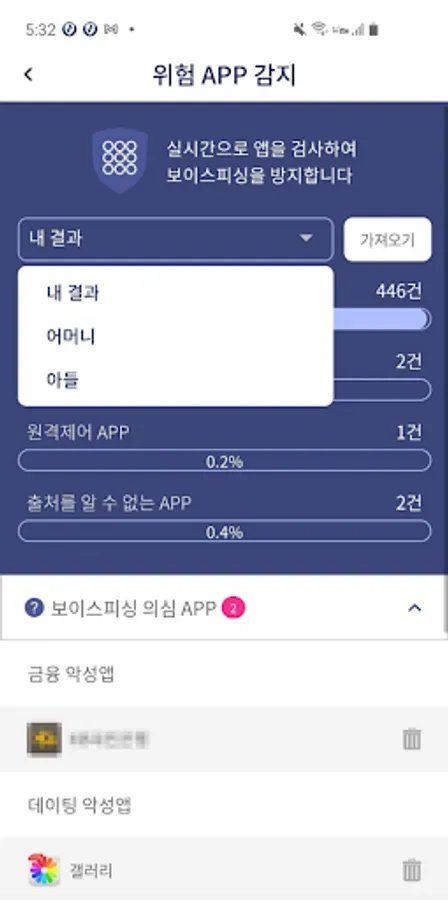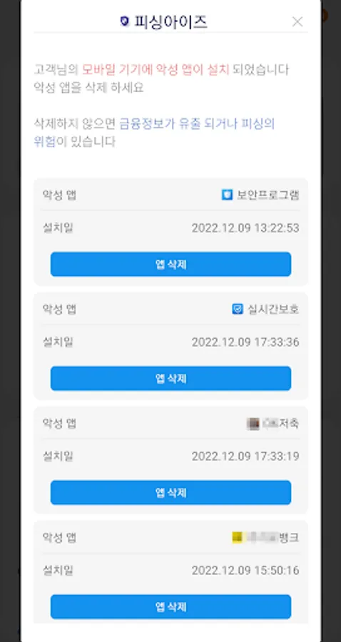 보이스피싱 및 해킹의 위험이 있는 악성 앱이 설치 및 탐지될 시 알림을 제공하며 제휴된 금융사에서 보이스피싱을 차단하도록 합니다.