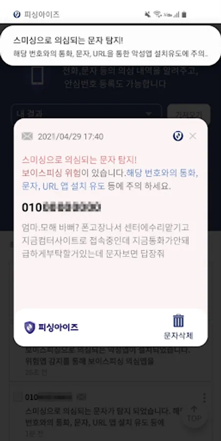 보이스피싱 및 해킹으로 이어질 수 있는 악성 IP/URL이 포함된 메시지, 가족과 지인을 사칭하는 메시지 등 보이스피싱에 활용되는 문자를 탐지하여 알림 제공합니다.