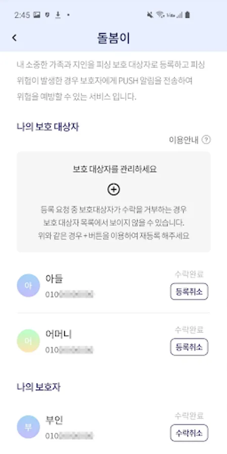 보호 대상으로 번호를 등록한 가족 및 지인의 휴대폰에서 악성 앱 설치 및 보이스피싱 의심 징후 탐지 시 고객님께 알림 제공