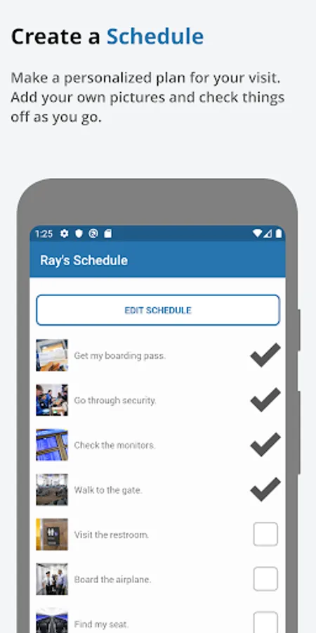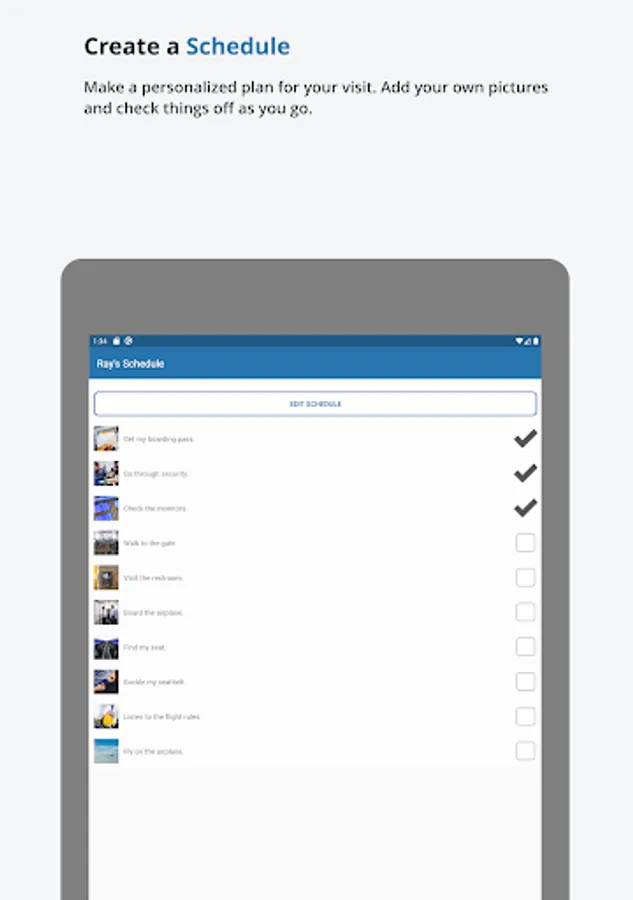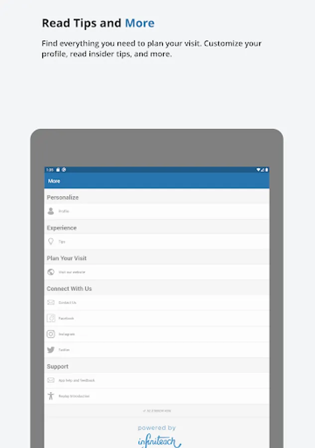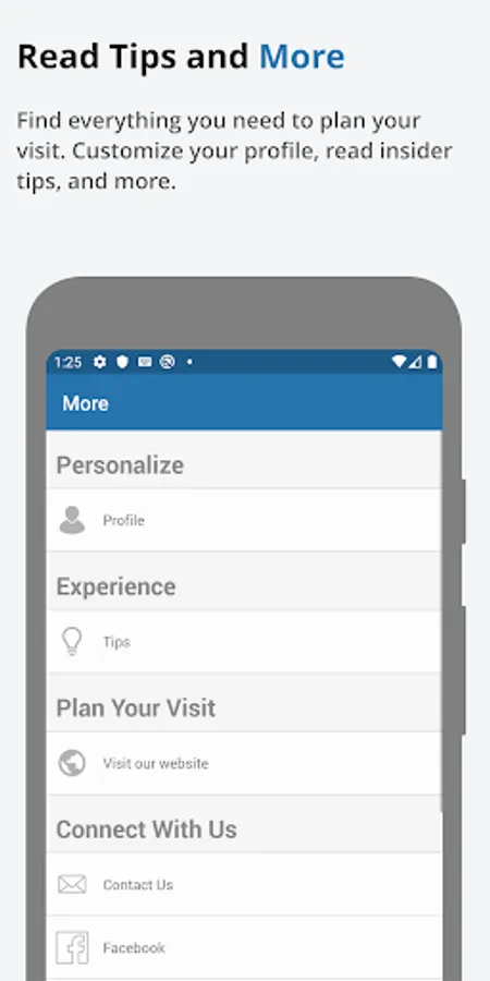 Customize your profile, find travel tips, find links to detailed information about our accessibility services, connect to our social media, share feedback, and rate our app.