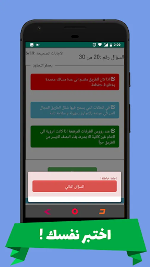 An easy and light application that does not need the Internet that includes an Arabic driver's license exam form with traffic signals approved in most Arab countries. This application is specially designed for the Lebanese driving license test, however it can be used by other Arabs because most of the questions are common, such as Egypt, the UAE and Saudi Arabia. The application contains:
