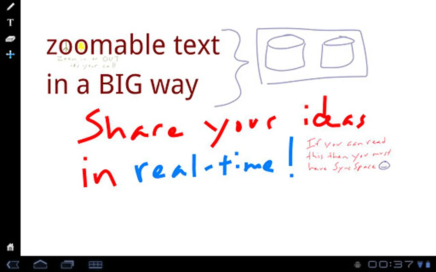 SyncSpace for Android provides a zoomable drawing space that can be shared in real time over the net, a sort of shared whiteboard. Turn on synchronization and send a link to the document to others who will be able to see your drawing and also make changes using SyncSpace.