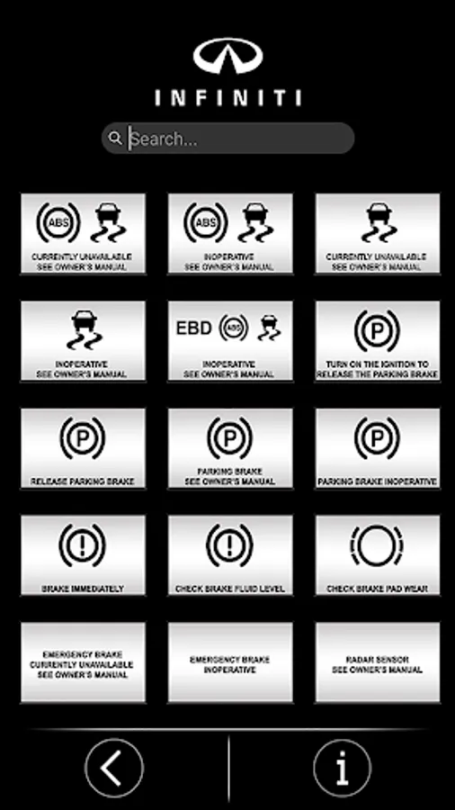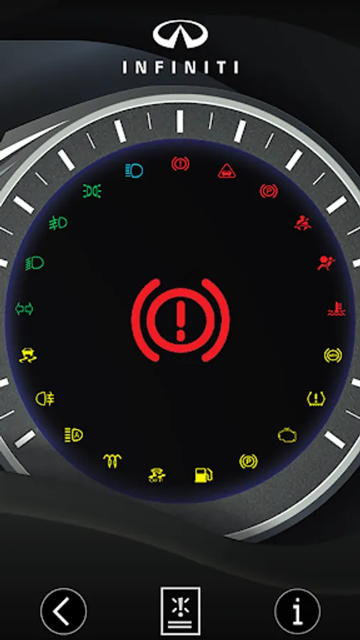 When a warning light is displayed on your vehicle's combination meter, the INFINITI Driver's guide provides you with quick access to additional information.